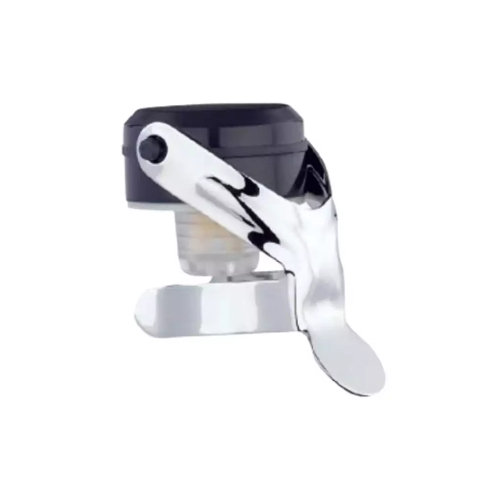 Tampa universal para garrafas de espumante tipo italiana, produzida em aço cromado e plástico, com polímero específico para uso alimentar na parte interna.
